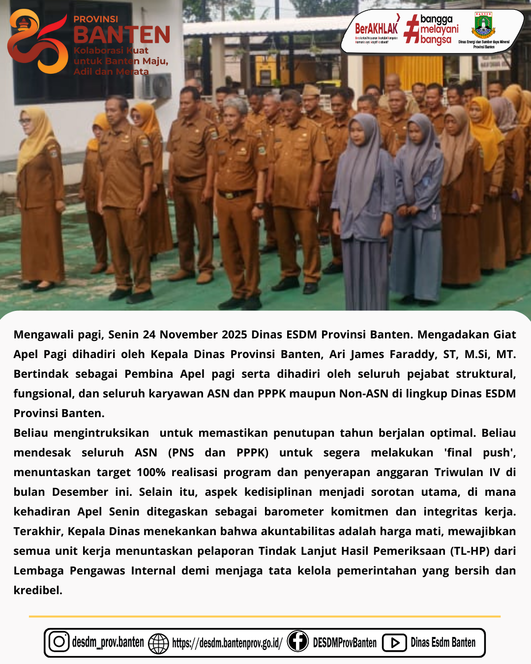 Sumber Gambar :Mengawali pagi, Senin 24 November 2025 Dinas ESDM Provinsi Banten. Mengadakan Giat Apel Pagi dihadiri oleh Kepala Dinas Provinsi Banten, Ari James Faraddy, ST, M.Si, MT. Bertindak sebagai Pembina Apel pagi serta dihadiri oleh seluruh pejabat struktural, fungsional, dan seluruh karyawan ASN dan PPPK maupun Non-ASN di lingkup Dinas ESDM Provinsi Banten.